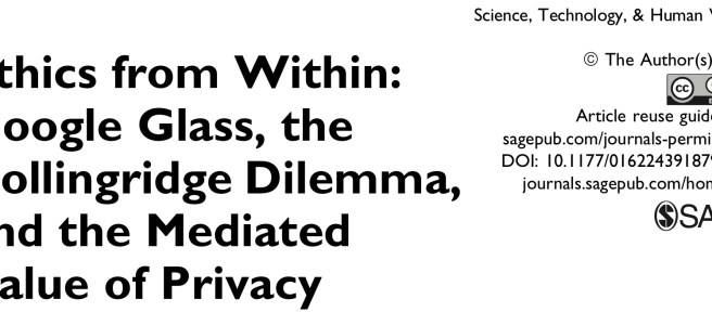 Just out in Science, Technology, and Human Values: ‘Ethics from Within: Google Glass, the Collingridge Dilemma, and the Mediated Value of Privacy’, with Olya Kudina (@kuzenka167). How to do ethics of technology when technologies change ethical frameworks? http://journals.sagepub.com/doi/pdf/10.1177/0162243918793711