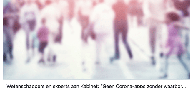 “Corona-apps vergen waarborgen voor grondrechten en aandacht voor ethiek en maatschappelijke impact”: een brief aan het Kabinet, geïnitieerd door ALLAI en ondertekend door meer dan 60 wetenschappers, waaronder ikzelf. Zie: https://allai.nl/wetenschappers-en-experts-aan-kabinet-geen-corona-apps-zonder-waarborgen-voor-grondrechten-en-aandacht-voor-maatschappelijke-implicaties/