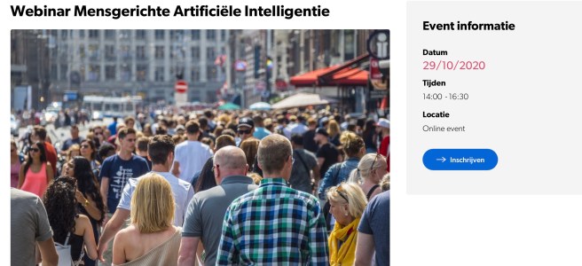 29 november, dataweek: lezing over de invloed van AI op mens en maatschappij en de (ethische) vragen die dit met zich meebrengt, en presentatie White Paper over Maatschappelijk verantwoorde Artificiële Intelligentie, met afwegingen over de mogelijkheid van een ‘ethische code’ tussen overheid, bedrijfsleven en wetenschap en inwoners van Nederland. Zie: https://nlaic.com/agenda/webinar-mensgerichte-artificiele-intelligentie/