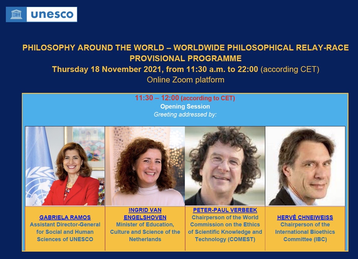 For World Philosophy Day 2021 (Nov 18) we are organizing an intercultural philosophical relay race with speakers from all over the planet. Initiated by the UNESCO World Commission for the Ethics of Science and Technology (COMEST), the International Bioethics Commission (IBC), and the Dutch national commission for UNESCO. More information: https://events.unesco.org/event?id=2216203644&lang=1033.
