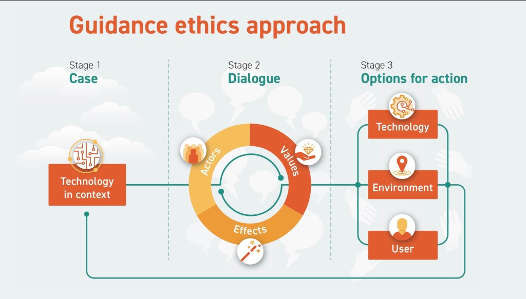 The ‘Guidance Ethics Approach‘ offers concrete ethical guidance for the design, implementation and use of technologies. It was developed with the working group on Ethics and Digitalization of ECP | Platform for the Information Society. The approach has three distinct characteristics: