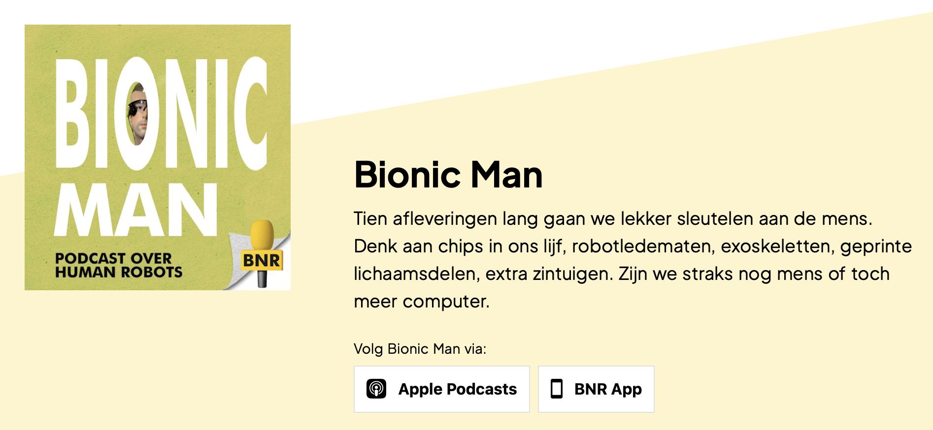 Een reeks van 10 afleveringen over mens en technologie, met Robin Rotman als presentator en Peter Joosten en mijzelf als experts (zomer 2018). Zie: https://www.bnr.nl/podcast/bionicman en ons Spotify-kanaal.